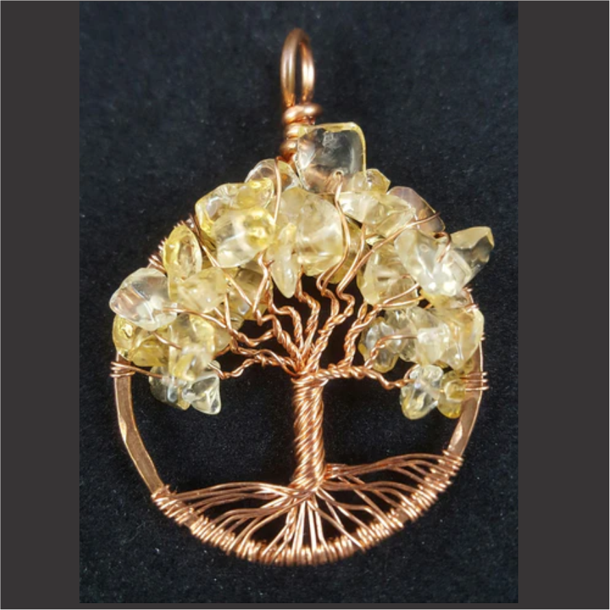 This pendant contains Citrine crystal chips woven into a copper wire tree.