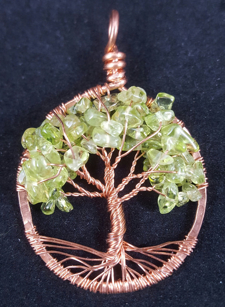 This pendant contains Peridot crystal chips woven into a copper wire tree.