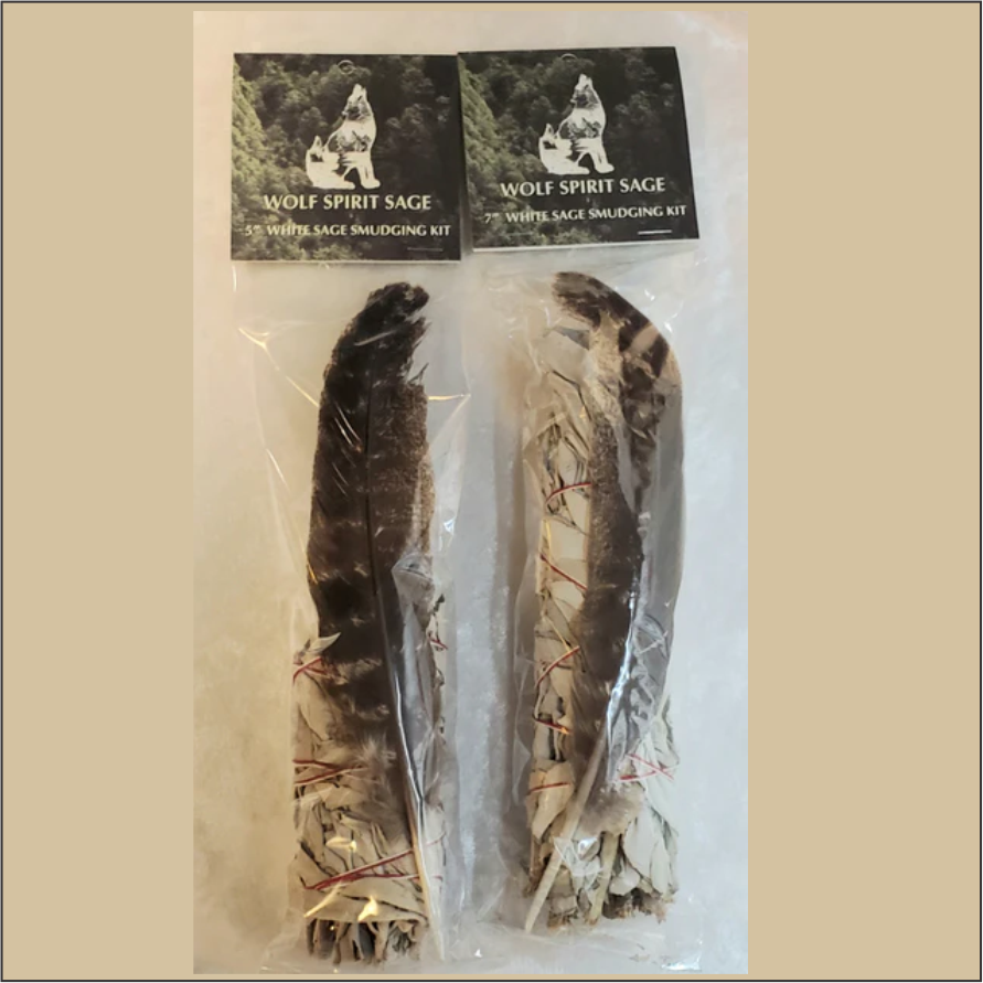 These nice sage smudge kits contain a white sage wand and an 11-12" long feather.